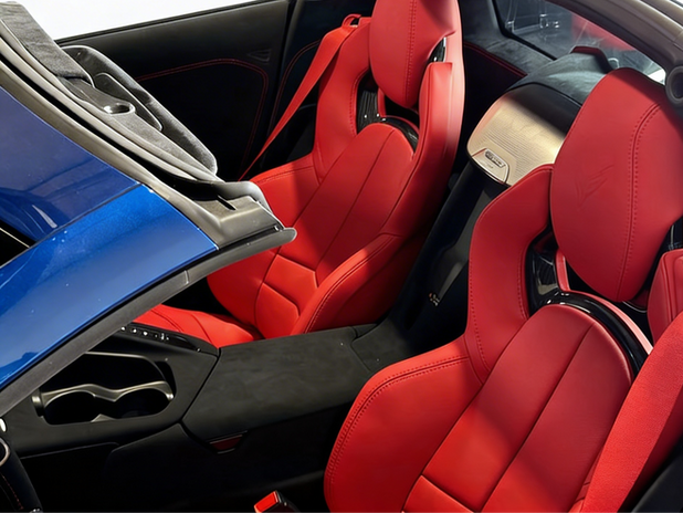Caravaggio Corvettes presents the Series1 C8 Corvette model 5 of 25, a striking fusion of performance and bespoke craftsmanship. Finished in dazzling Sequins Blue, this limited-edition build features a full Alcantara interior with bold red seatbelts and rich red leather seats for a dramatic contrast. Under the hood, an Eventuri cold air intake and Caravaggio exhaust enhance performance, while lowered suspension sharpens its stance. The cabin and engine bay are outfitted with gloss-finished carbon fiber touches, including carbon door sills, paddles, and engine bay surround, emphasizing the car’s high-end detail. Protected by full PPF and ceramic coating, this Corvette is both a showpiece and a driver's machine.